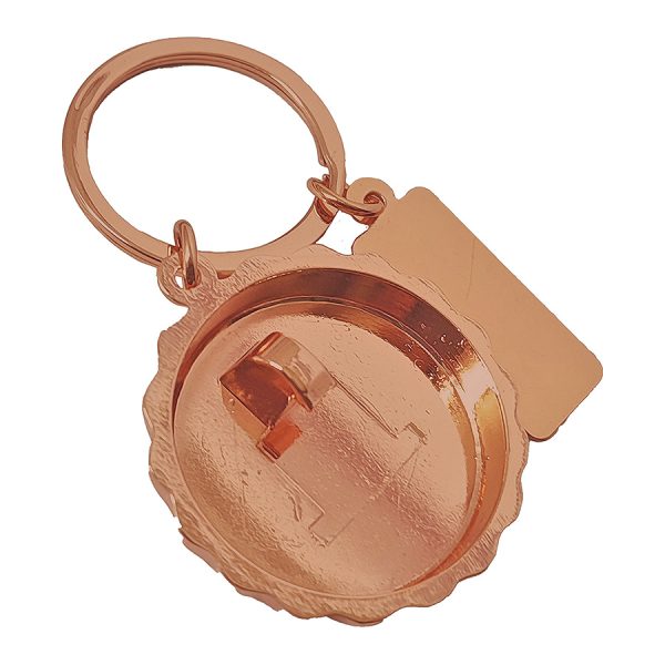 Llavero metálico Tapa Destapador electro plateado en color cobre. Presentación en estuche de cartón laminado color negro con cuna interior de terciopelo.