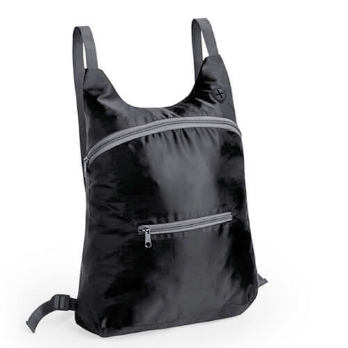 Mochila plegable en suave poliéster 210D, con cierre de cremallera, bolsillo frontal y salida de auriculares. Con esquinas reforzadas, cintas de hombro regulables y accesorios en color gris. Plegado de pequeño tamaño con cinta de transporte.