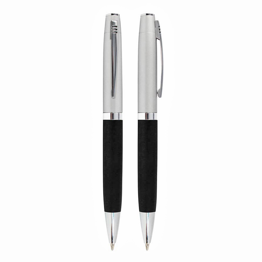 Bolígrafo Metálico bicolor modelo «Chairman». Cuerpo inferior superficie engomada negra, cuerpo superior plata satinado, terminales cromados. Escritura negra.