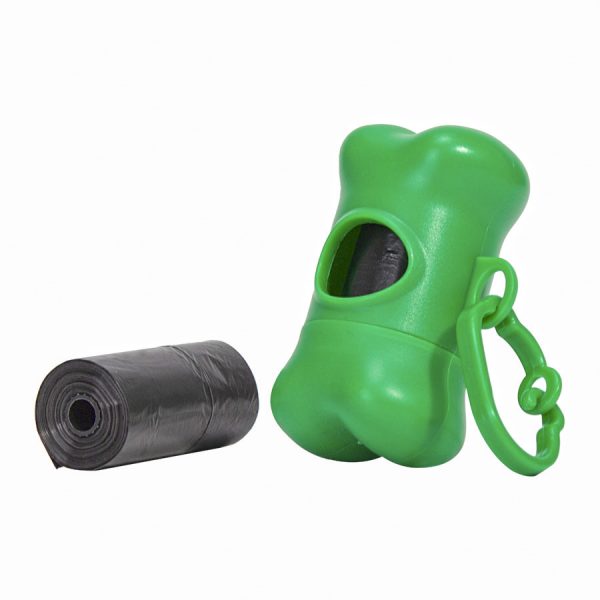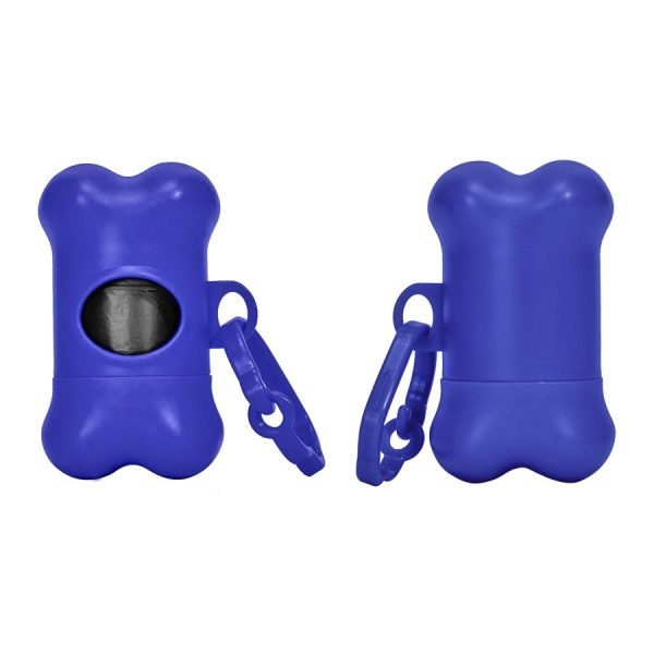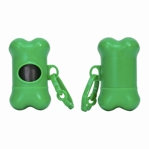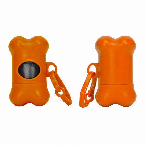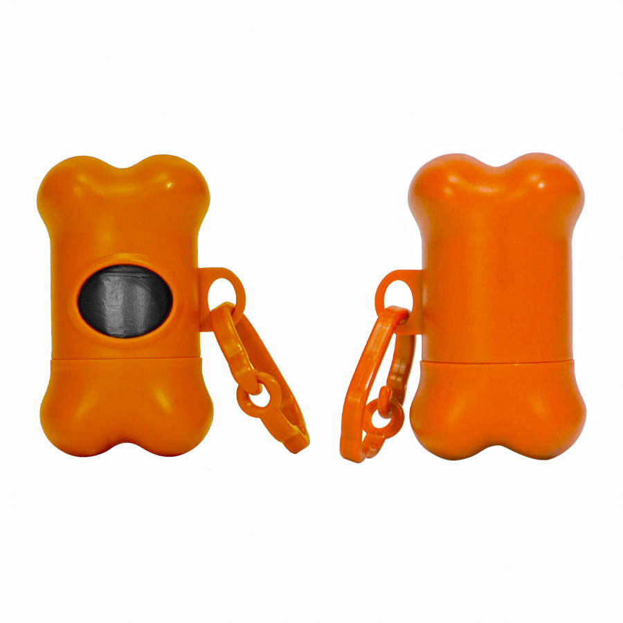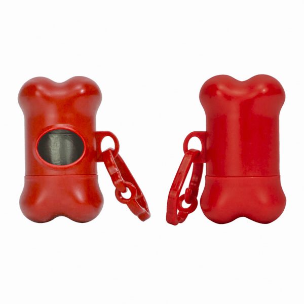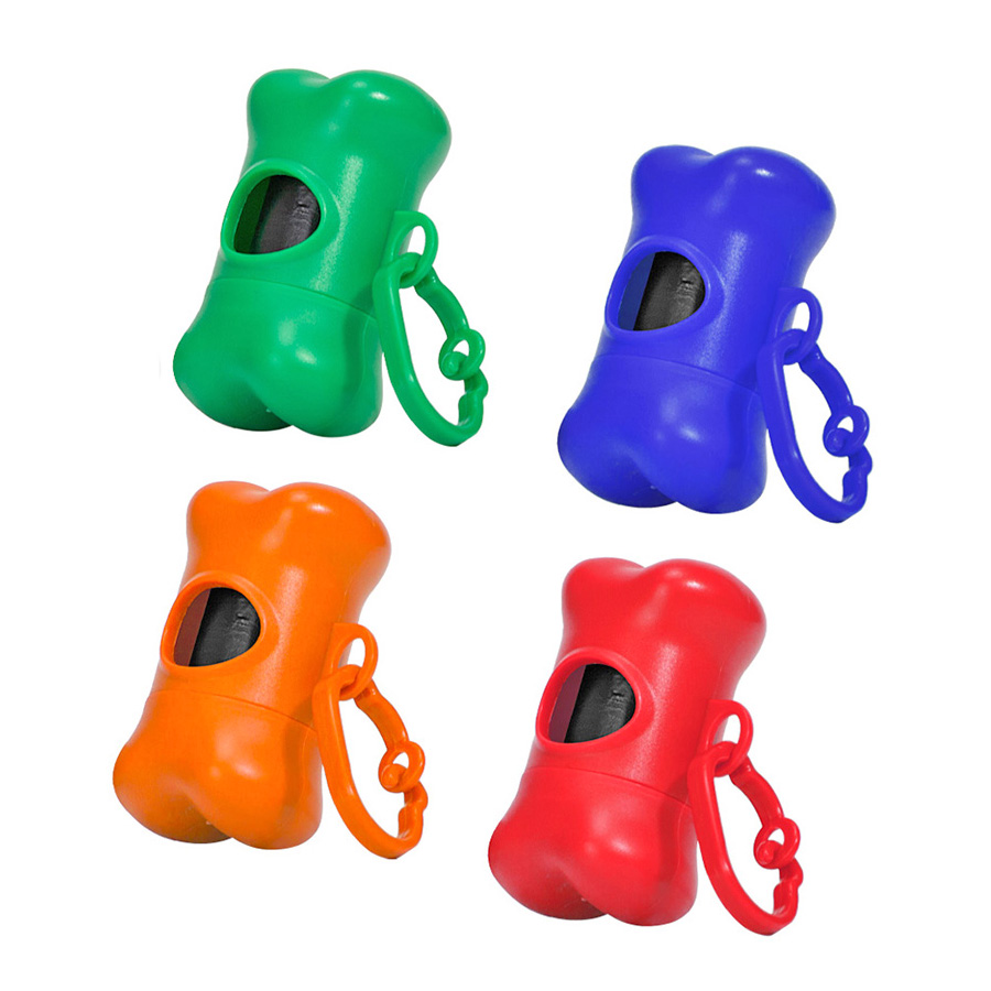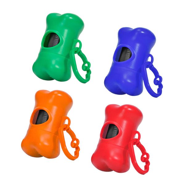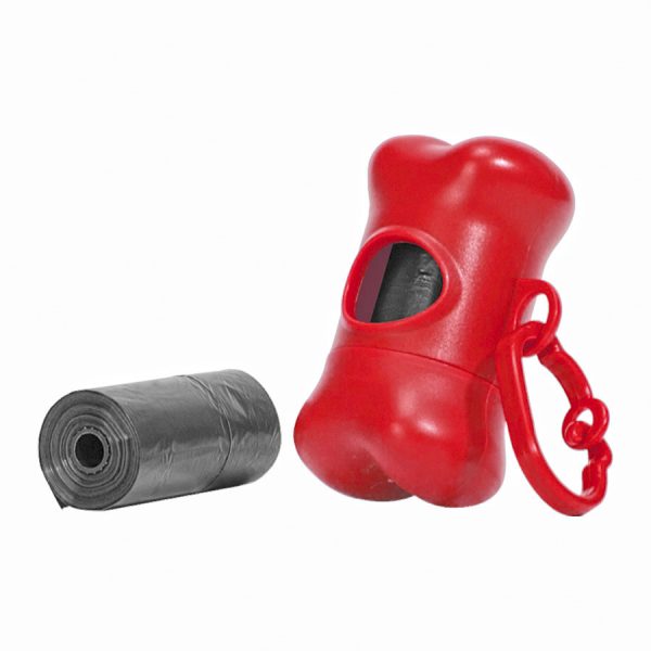 Set (rollo) de 15 bolsitas plásticas negras, para residuos de mascotas. Contenido dentro de un porta-bolsas de plástico EPI de color, con forma de hueso. Incluye un mosquetón plástico para colgar. El contenedor con forma de hueso es reutilizable